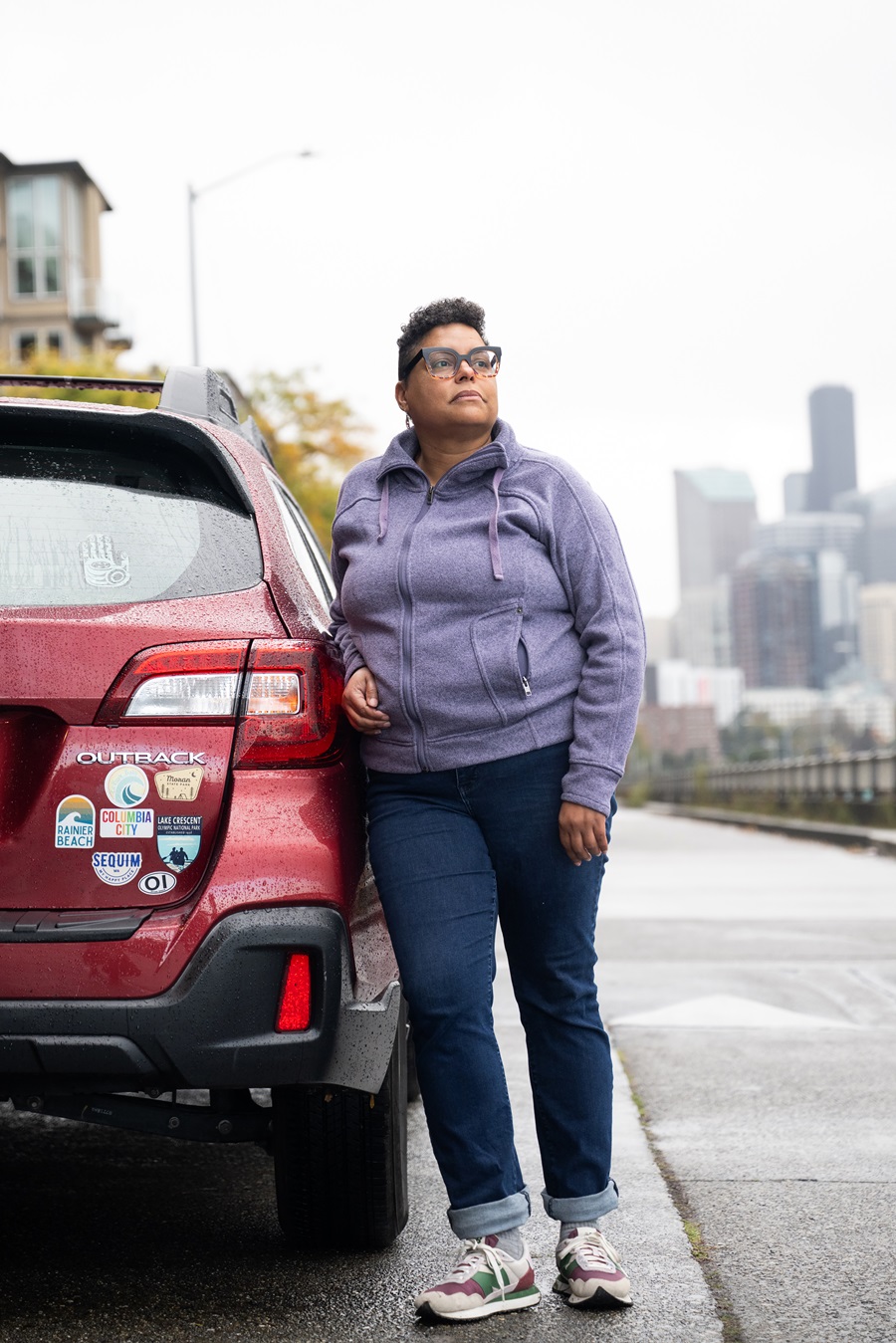 Jennifer Alba, who lost her job at a non-profit in February, with her “Ruby Subie” car. Credit: Chona Kasinger for The New York Times