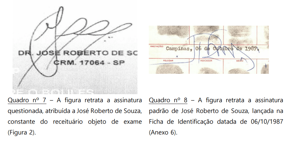 “The image of the signature in the name of the doctor José Roberto de Souza, included in the prescription book subject to examination, is FALSE (…), as such signature does not present the same graphic characteristics” as original documents signed by the professional and analyzed by experts, says report of Police expertise.