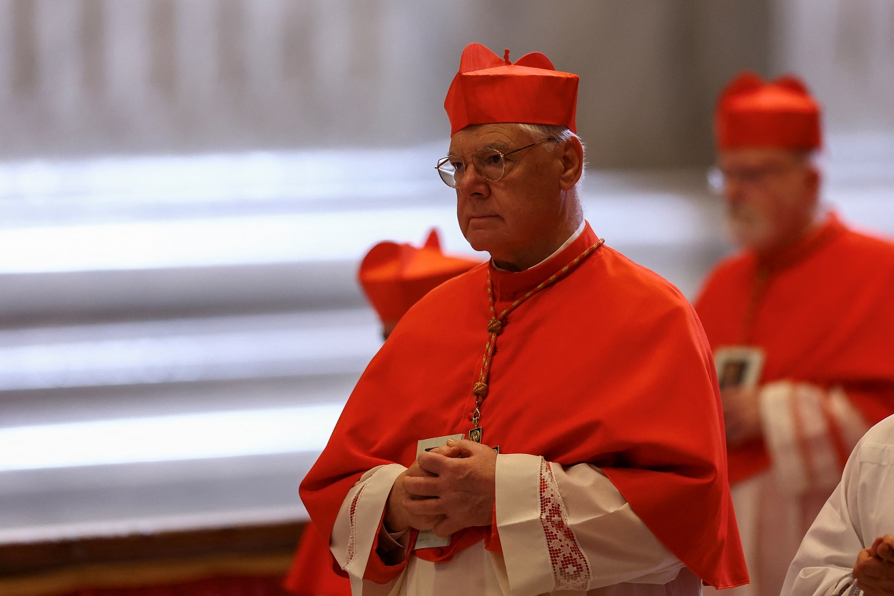Cardinal Gerhard Ludwig Müller arrives at St. Peter’s Basilica, while Pope Francis’ body is carried in a coffin inside the Basilica, on the day of its translation at the Vatican on April 23, 2025 (Reuters/Hannah McKay)